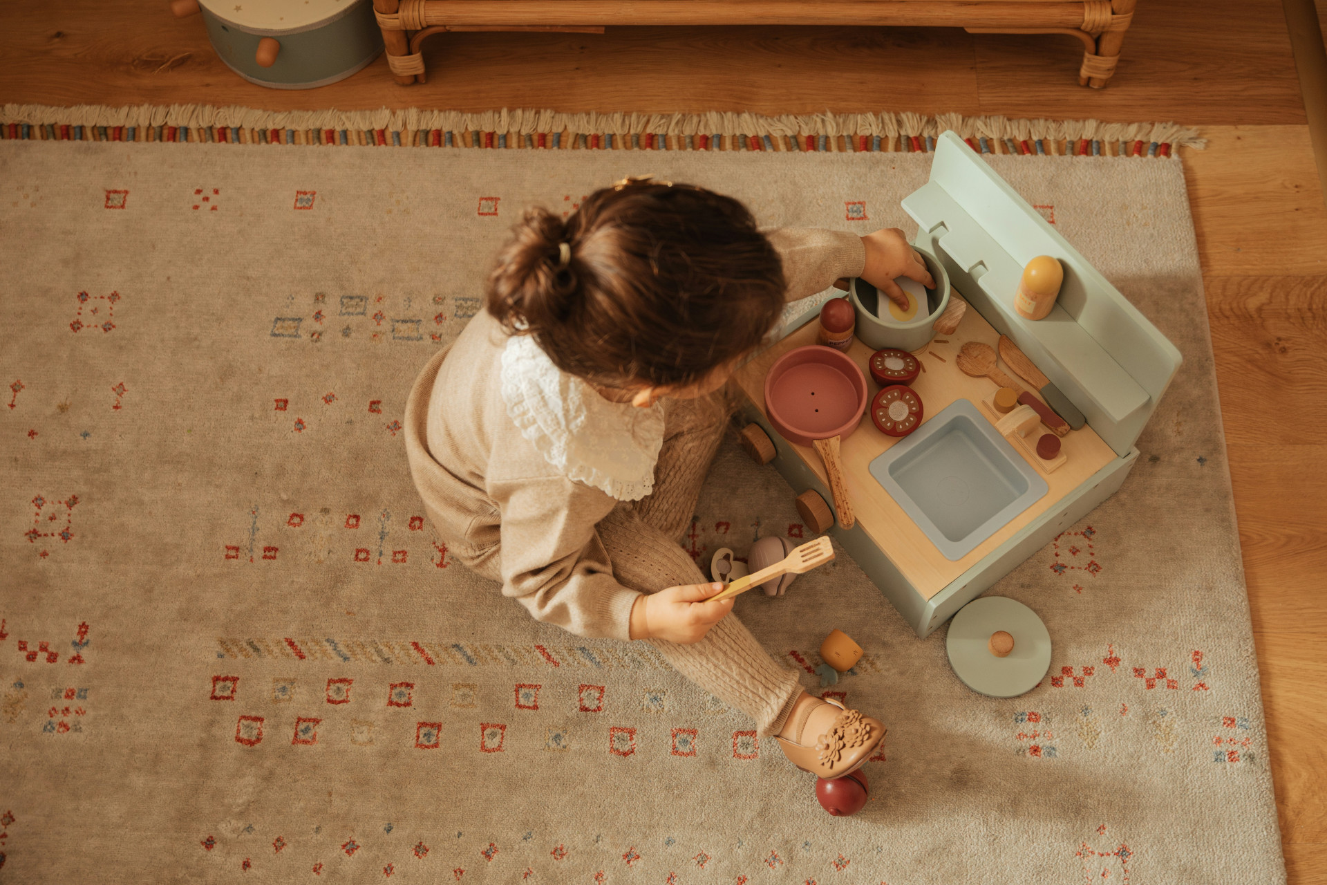 När leken är slut kan alla delar förvaras i själva köksväskan så att allt hålls samlat och redo för nästa gång.